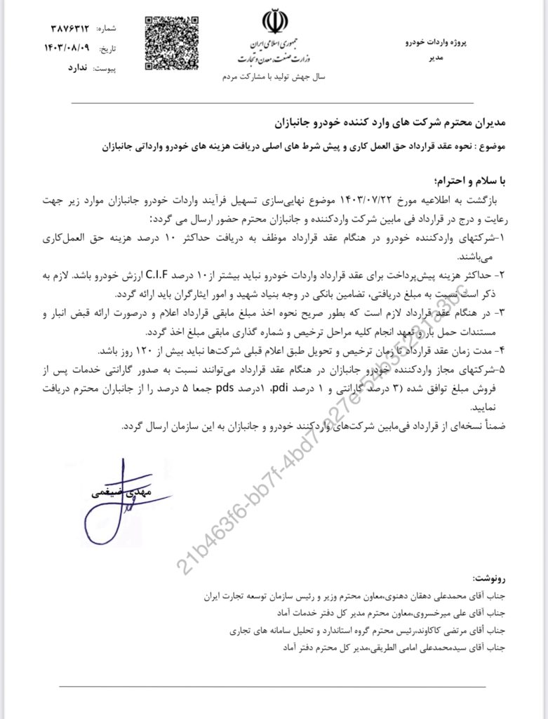 ضمنآً نسخهای از قرارداد فیمابین شرکتهای واردکنند خودرو و جانبازان به این سازمان ارسال گردد.